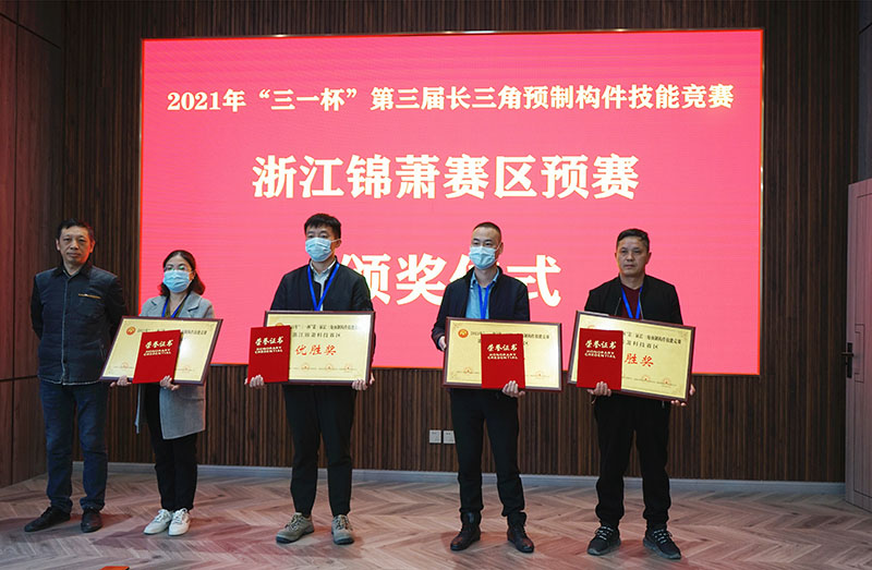 經過激勵的角逐,最終浙江永堅新材料科技股份有限公司,錦蕭建筑科技有限公司,浙江建楓裝配式建筑科技有限公司參賽隊表現突出,拿下比賽前三。賽后,作為承辦方,錦蕭科技總工程師王建忠分別為獲獎參賽隊頒發了榮譽證書,同時獲得前三的參賽隊成員也將獲得由海鹽縣人力資源和社會保障局給予的獎金獎勵。