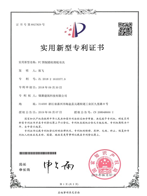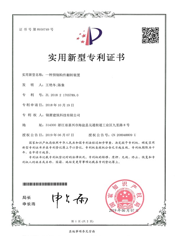 專利證書-一種隔熱隔聲預制稱重剪力墻